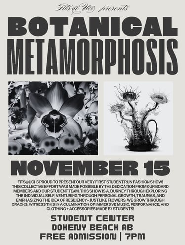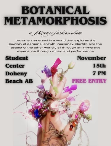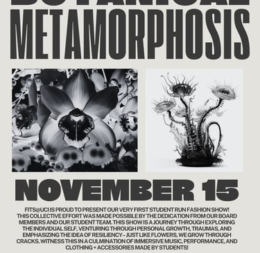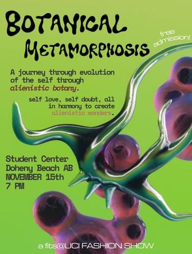 "Botanical Metamorphosis" was FITS@UCI's Fall 2024 fashion show, igniting an annual show every academic year. This runway in particular was an exploration of the human experience through the lens of extraterrestrial botany. Inspiration from fashion houses like MUGLER and Iris Van Herpen is evidently present, as well as musical influences by Shygirl, FKA Twigs, Kali Uchis, COBRAH, and Allie X. The show opened with HAUS OF LXBRA, a collection by Gilbert Hernandez that was a performance opening to Cleo by Shygirl.