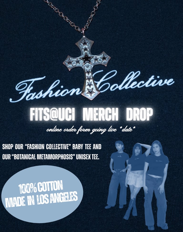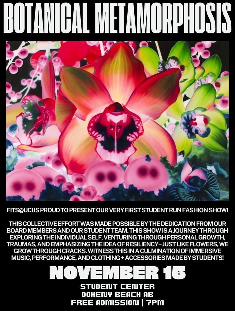FITS@UCI is the Fashion Collective at UC Irvine that prides itself on fostering an open space for creatives to come together! Through its committees (Production, Videography, Photography, Graphics/Media, Magazine, Operations), FITS is able to create campus-wide events for students! I served as social media director my sophomore year, was elected president my junior year, and was introduced and appointed to the role of Production Coordinator for our first fashion show, "Botanical Metamorphosis.